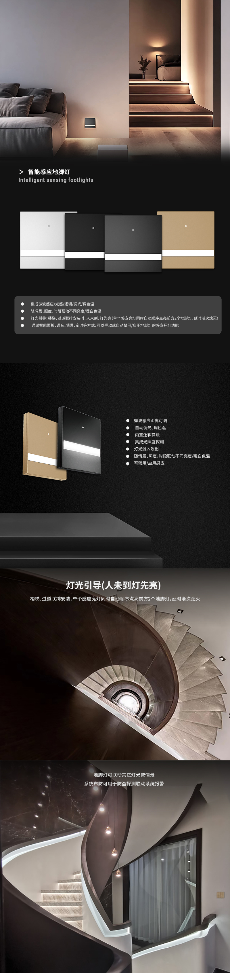 - 邏輯:內置24個自定義邏輯事件,實現不同時段不同亮度/色溫預置;樓梯、過道聯排安裝時,單個感應亮燈同時自動順序點亮前方2個地腳燈,實現“人未到,燈先亮”的燈光引導效果,延時漸次熄滅。